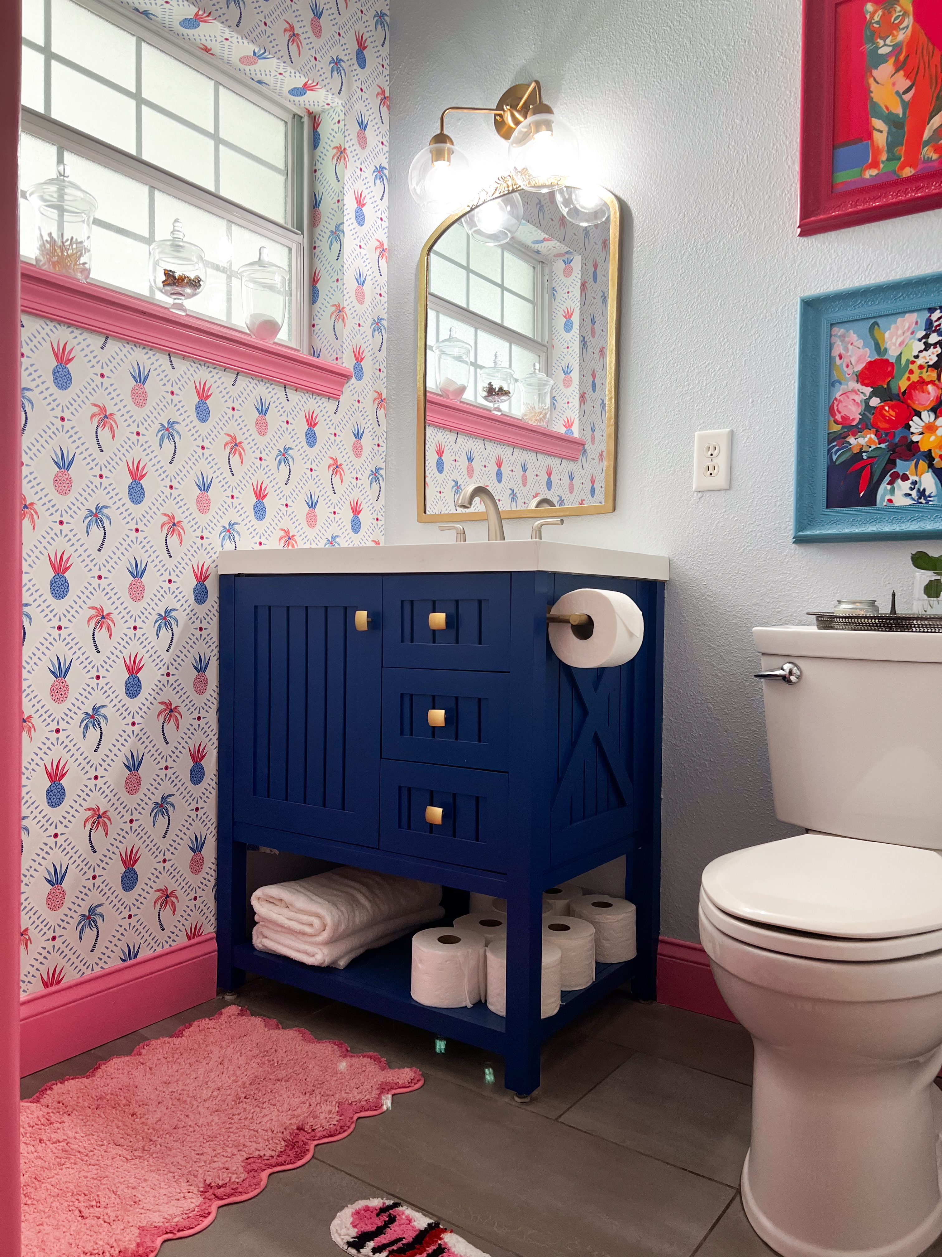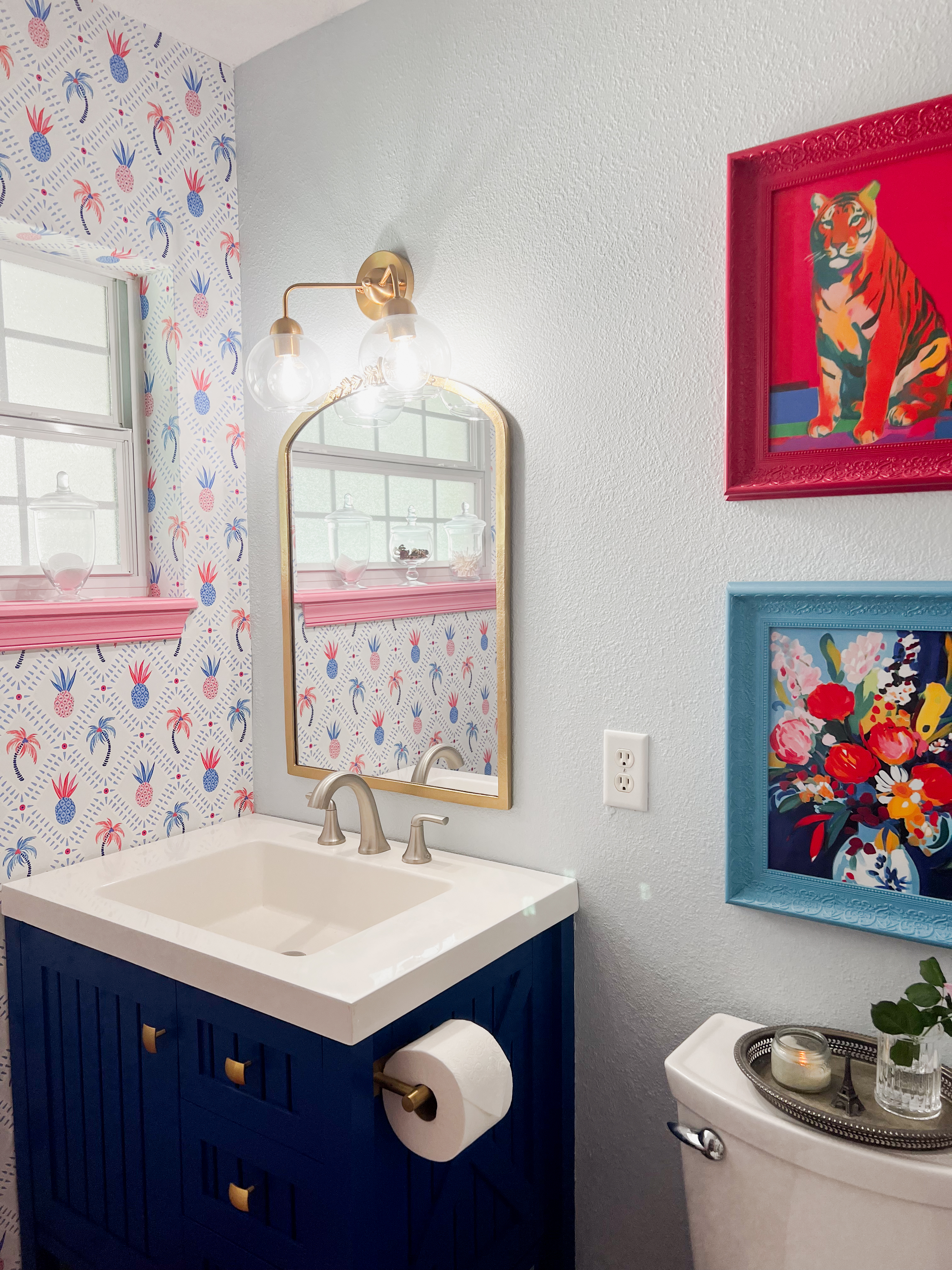 I held out for about 4 years until I finally changed up our less than 55 square foot bathroom and added a little bit of a personal touch to it. The idea of pineapples kept coming to mind but I didn’t want a traditional look. I wanted something more fun and playful and let’s face it, it’s hard getting up in the morning and going to work or getting ready for bed when you know you have to get some rest and really shouldn’t binge that episode of the show that just… keeps… bringing… the cliffhangers. UGH!
