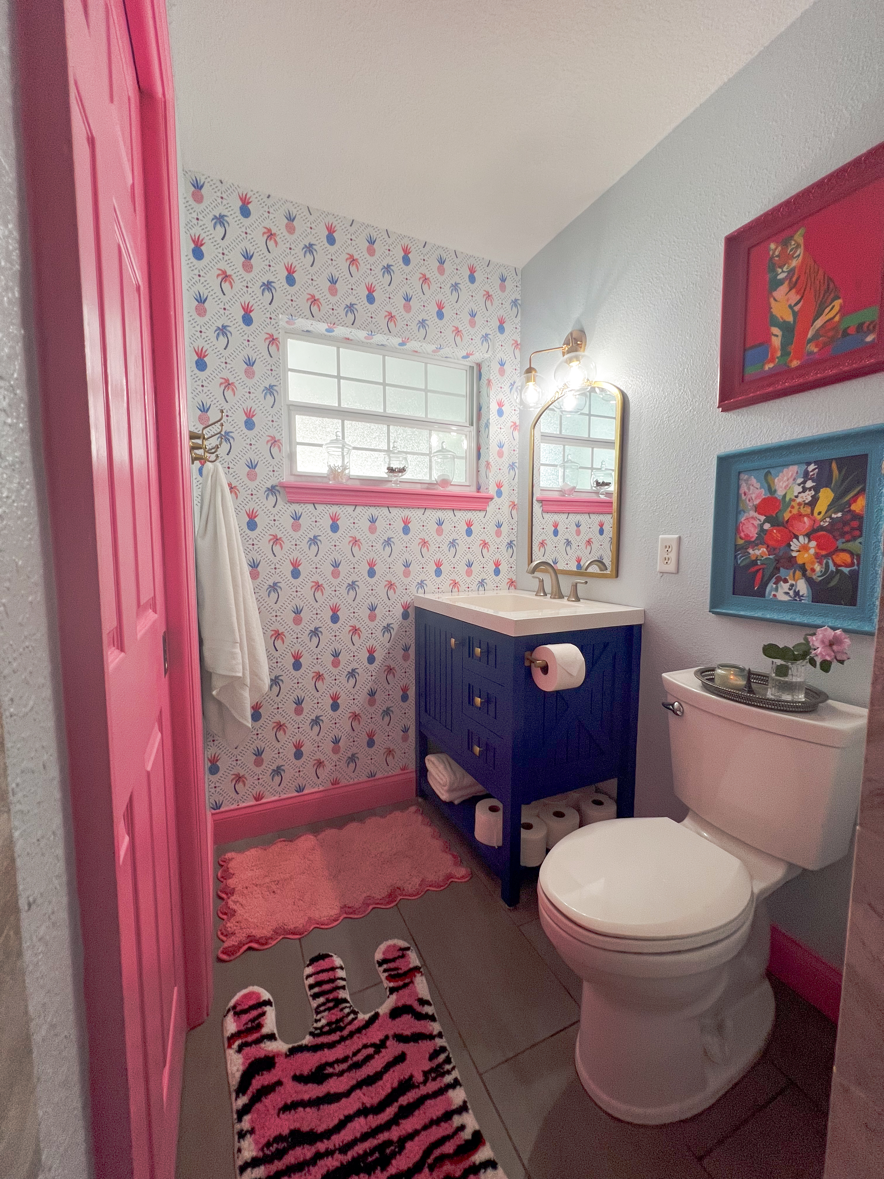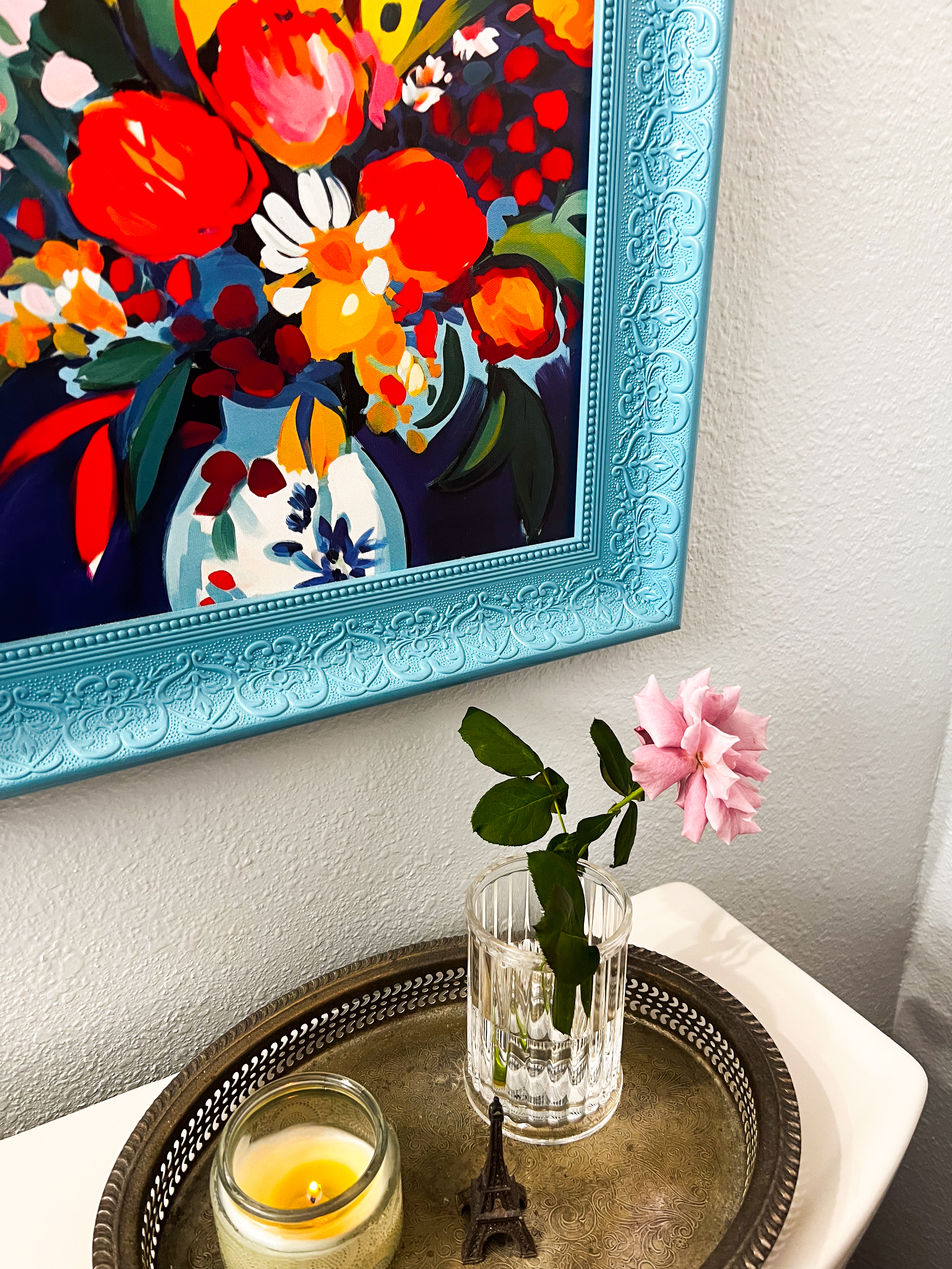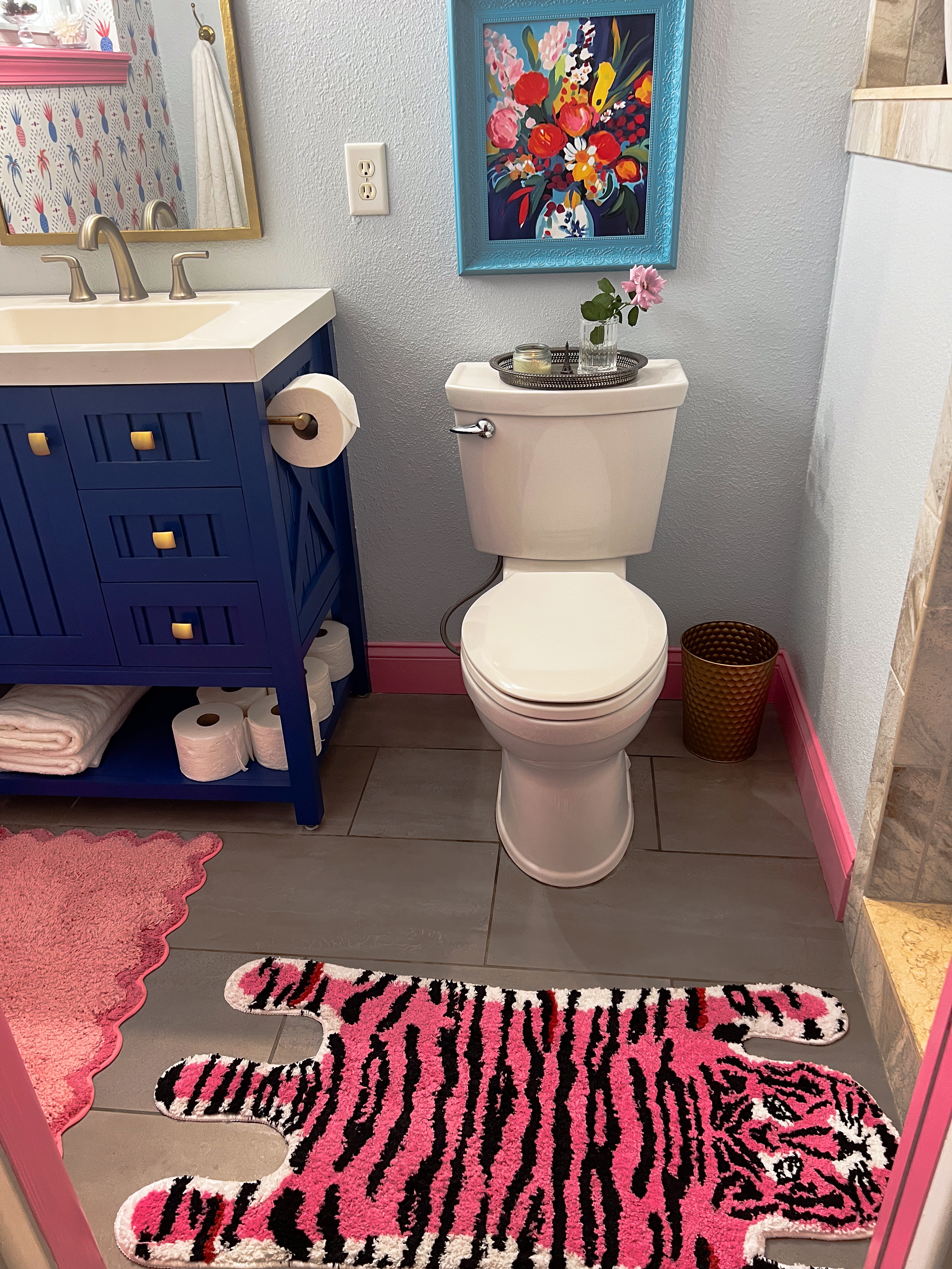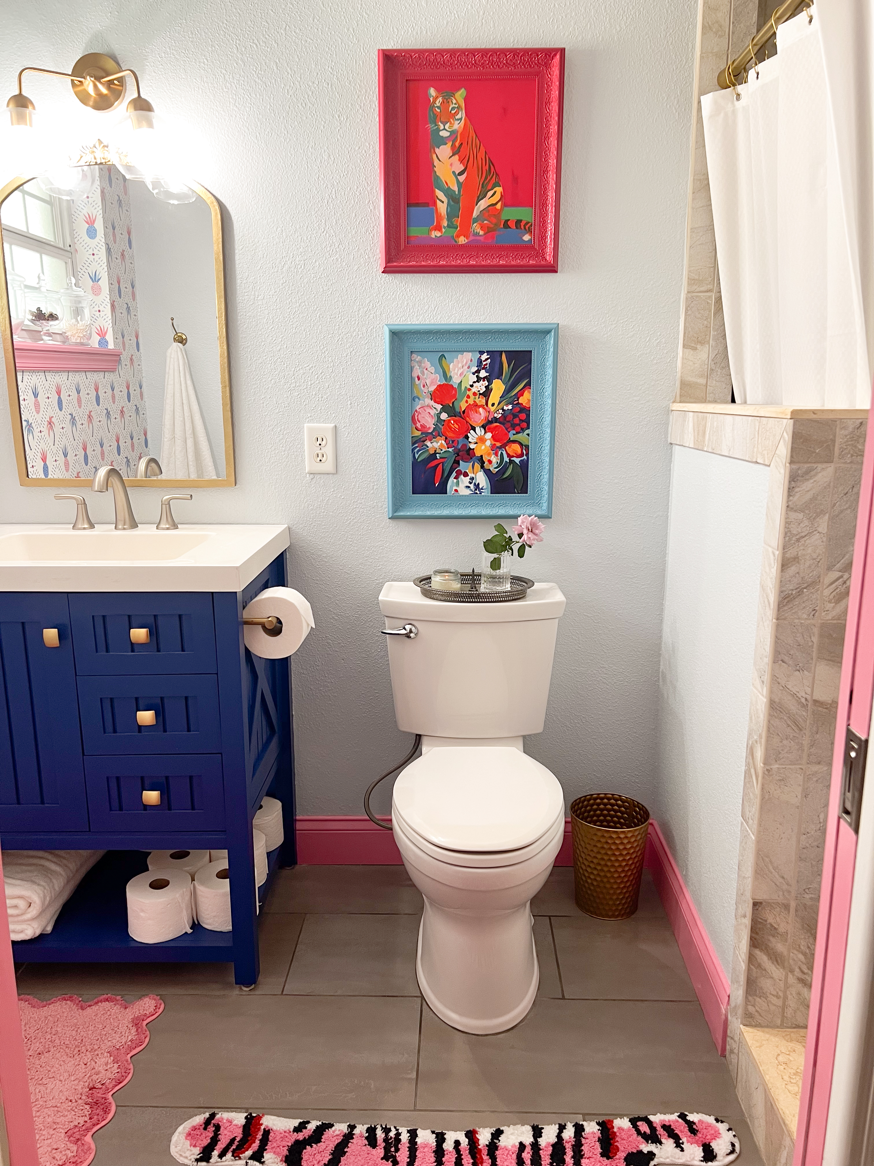 Back to what I was saying…FUN and playful, not stuffy and buttoned up was the look I was going for in our intimate en suite. Speaking of “ensuite,” as in it being of French origins, that had a hand in influencing this upgrade too. I do a lot of dreaming while being in my bathroom and one of those dreams is to one day visit Paris so there are subtle touches of French aesthetic in here too.